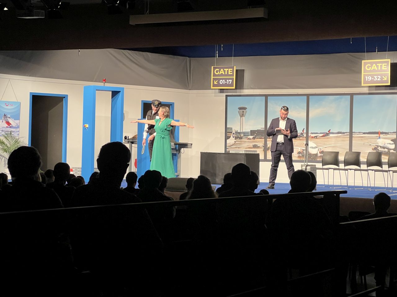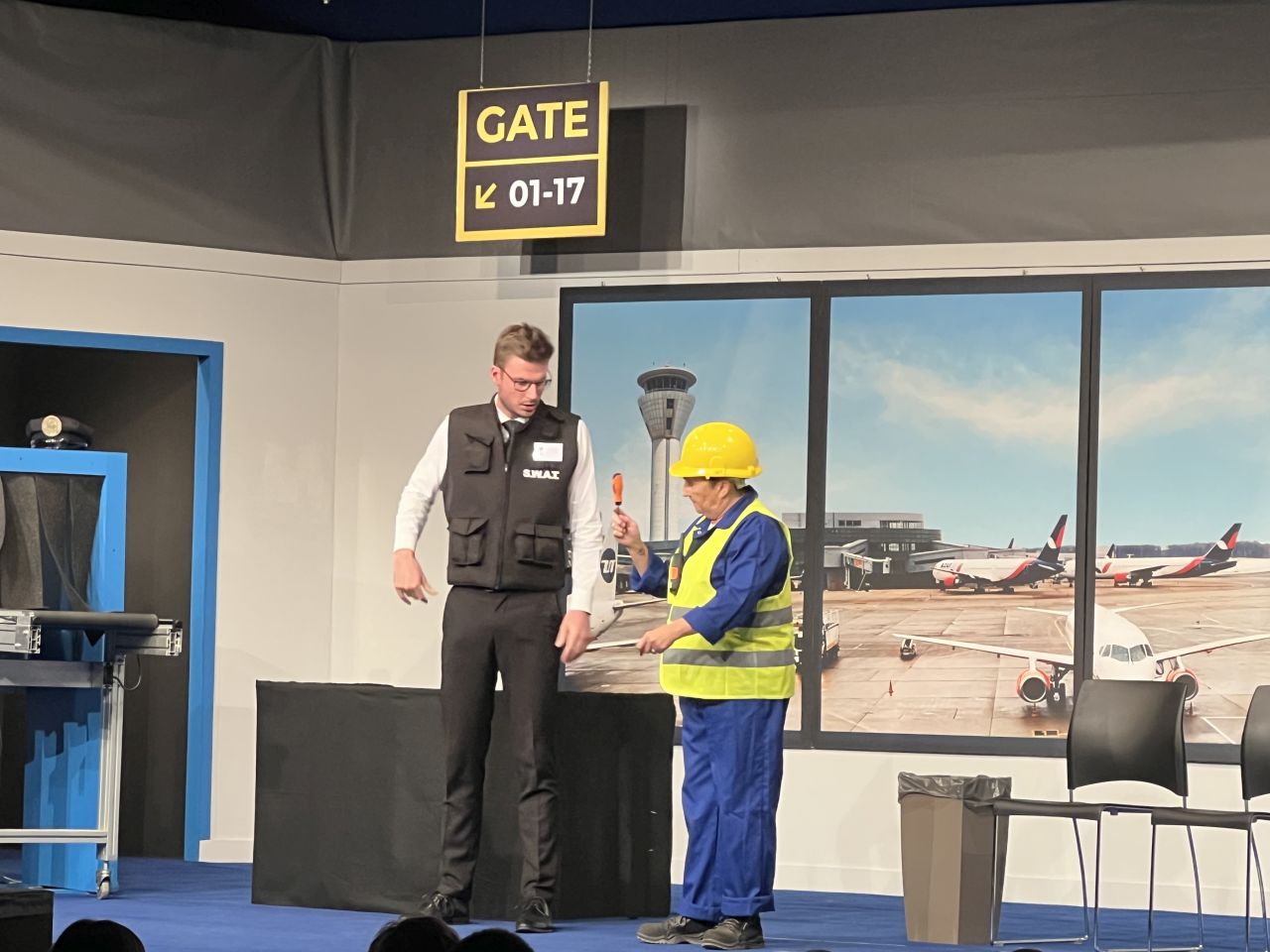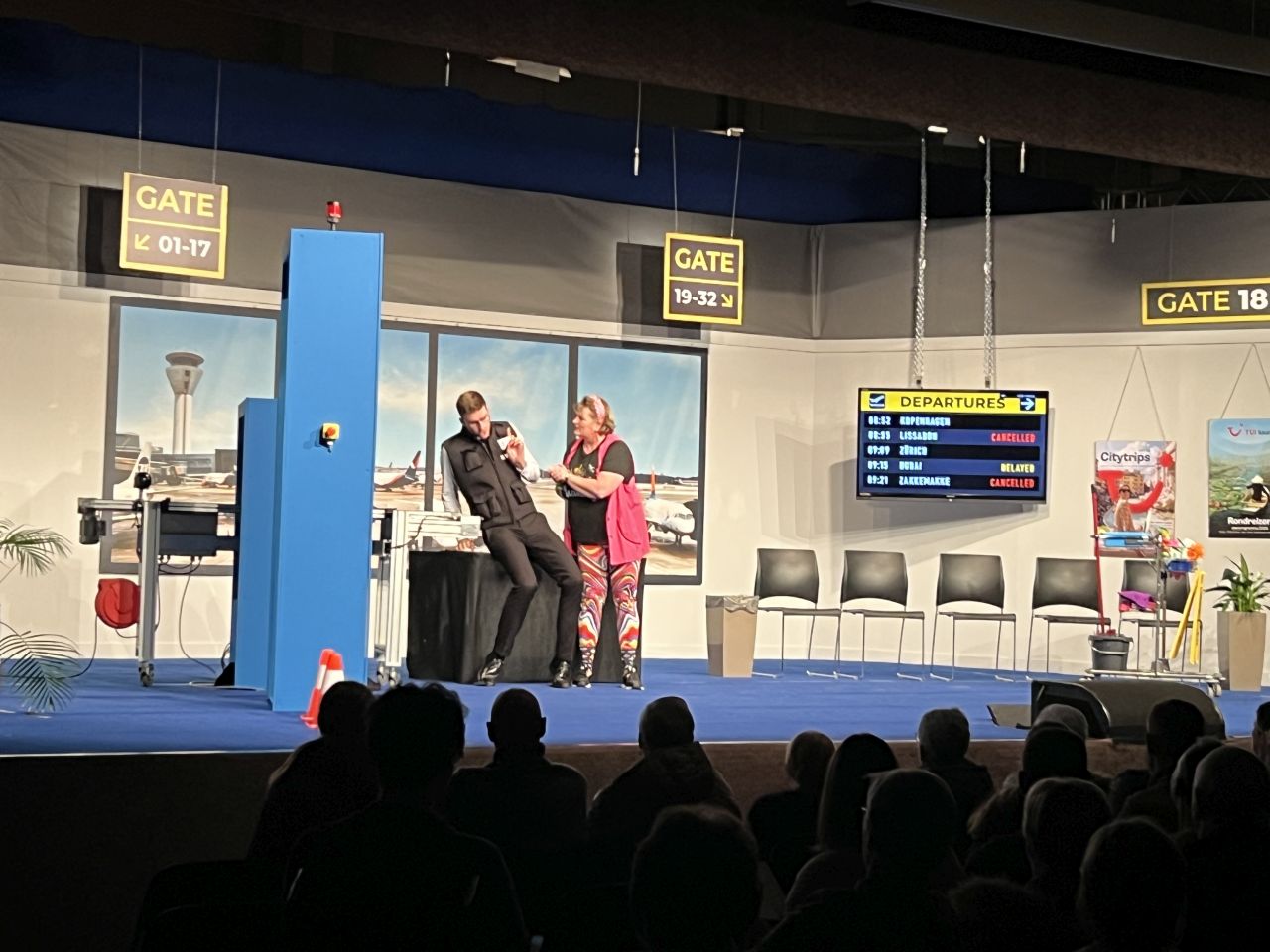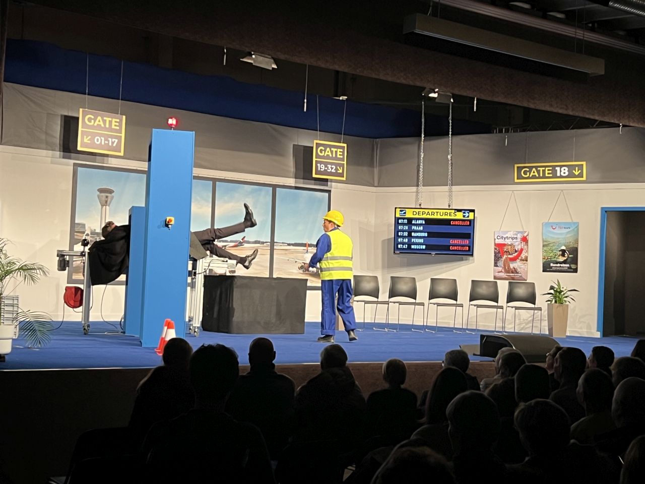 Nadine en Roger nemen voor het eerst het vliegtuig. Ruim op tijd staan ze in de luchthaven.